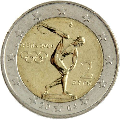 Die 2 euro griechenland wurde anlässlich der olympischen spiele 2004 in athen ausgegeben und zeigt einen diskusswerfer.